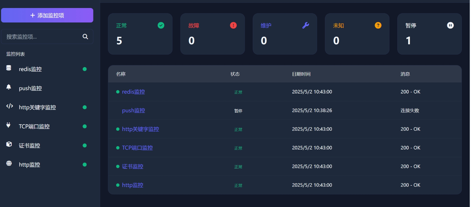 多种监控类型:支持HTTP/HTTPS网站、API接口、HTTPS证书过期、TCP端口、MySQL/Redis数据库等多种监控