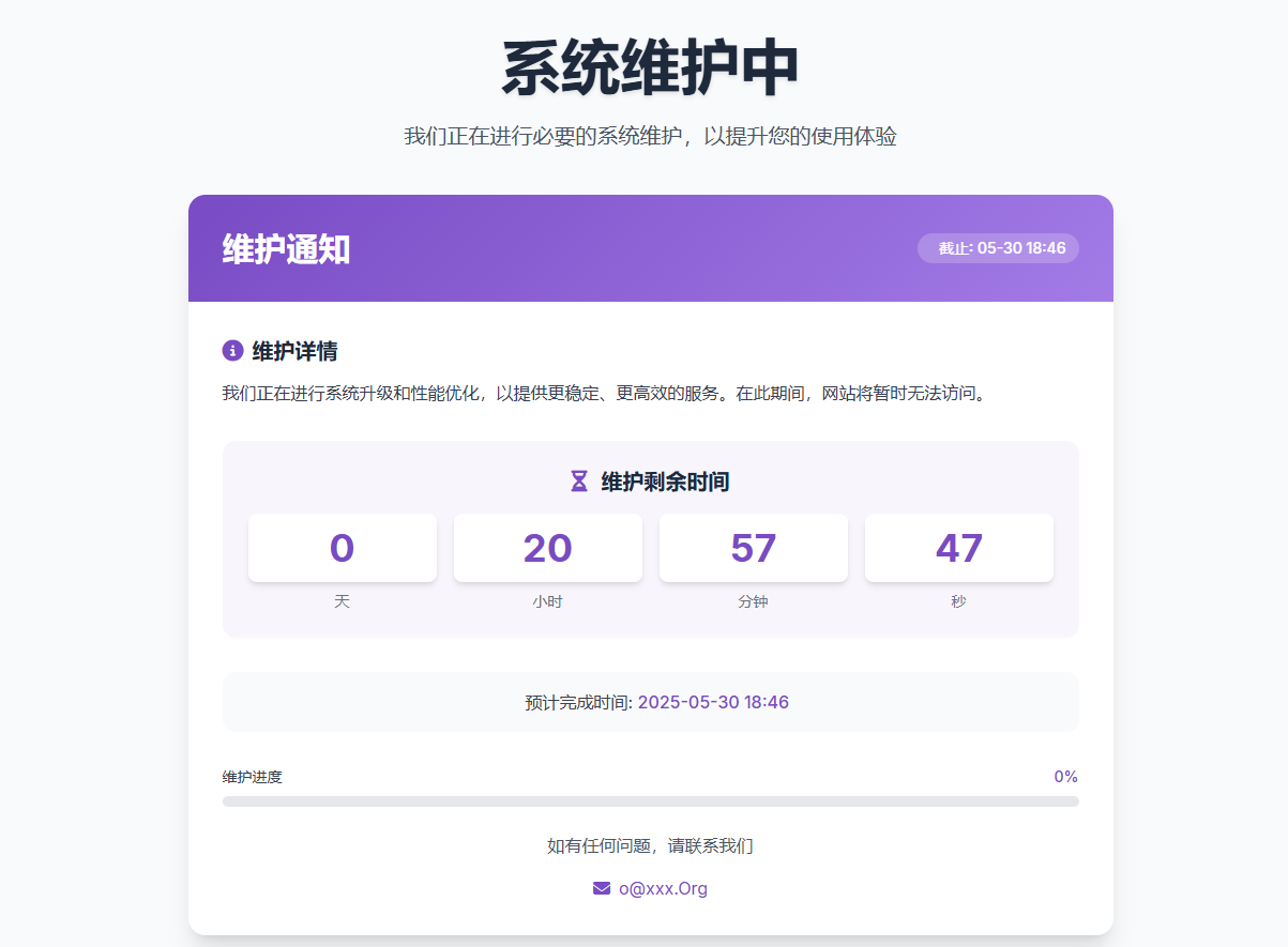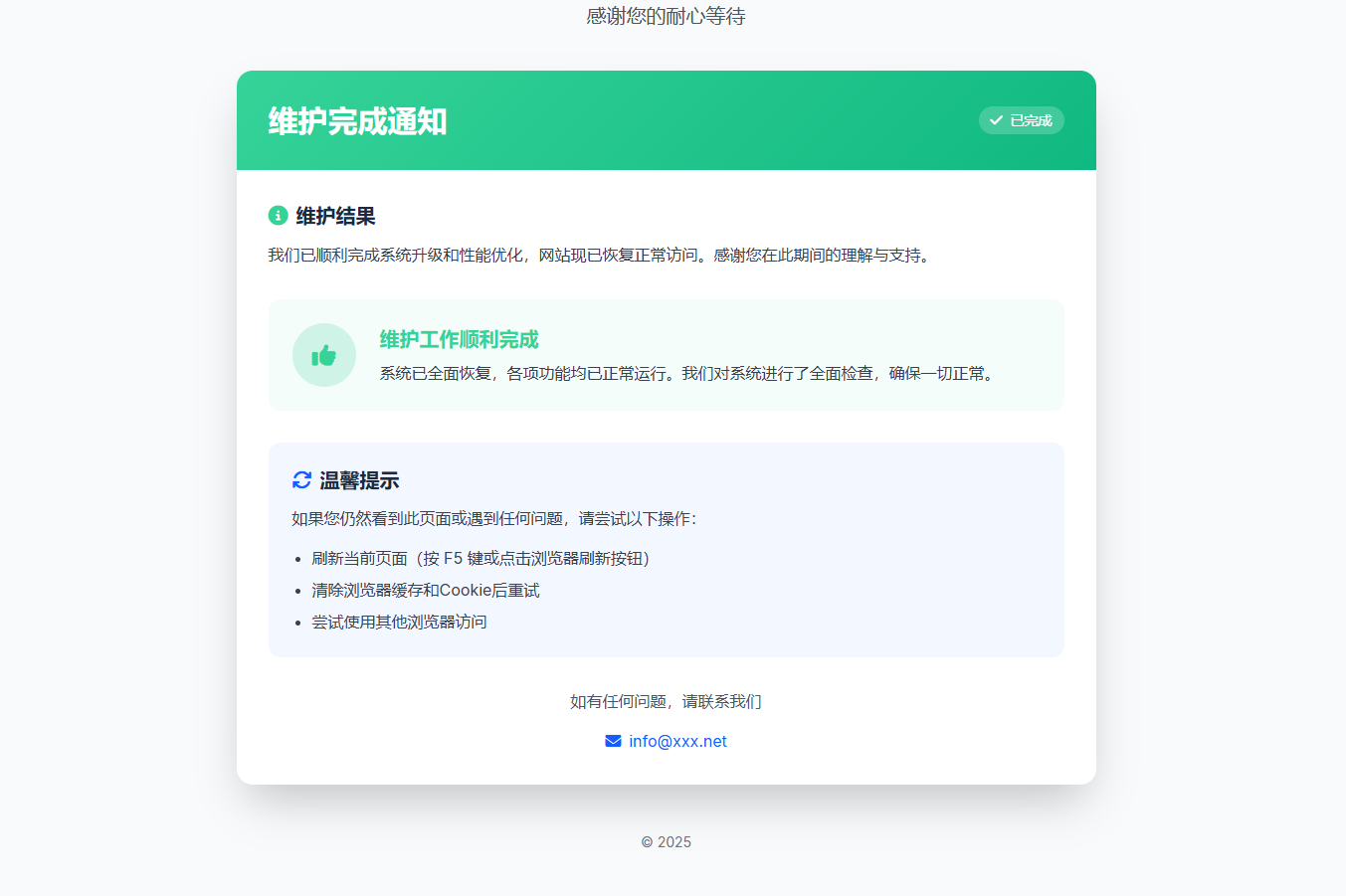 正文概述 评论 已弃用QQ,邮箱:[email protected] 【哔哩哔哩留言】上线看见信息第一时间回复,本站大部分源码亲测 网站维护带倒计时模板+维护结束模板 资源宝-—专注于优秀资源搜集共享与发布资源宝 » 网站维护带倒计时模板+维护结束模板 本站所有资源来源于网络,仅限用于学习研究;无任何技术支持!不得将上述内容用于商业或者非法用途,否则,一切后果请用户自负。信息来自网络,版权争议与本站无关。您必须在下载后的24个小时之内,从您的电脑中彻底删除内容。如果您喜欢,请支持正版。如有侵权请邮件与我们联系处理。 本站部分源码亲测,单个源码赞助前请咨询